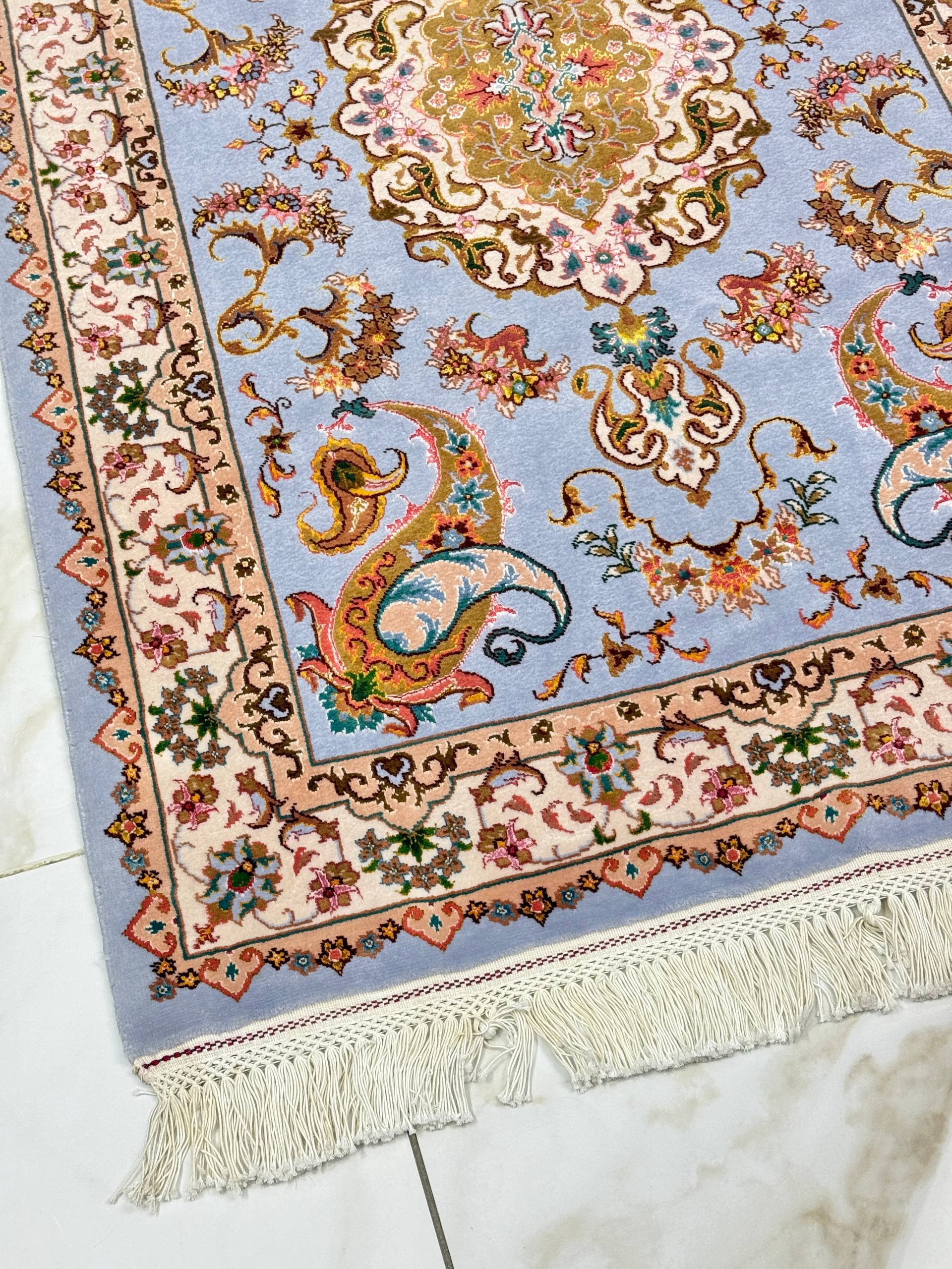 این فرش با ۴۰ رج، نقوش دقیق و خوانا ارائه میدهد و هر جزئیات را بهصورت کامل نمایش میدهد. بافنده از چله نخ برای ایجاد استحکام استفاده کرده و گل ابریشم را برای افزایش درخشندگی و ظرافت به کار گرفته است. این ترکیب، فرش را به اثری سبک، لطیف و بادوام تبدیل میکند و جلوهی آن را متمایز میسازد. رنگ زمینه که ترکیبی از طیفهای آبی و کرمیست، انرژی آرام و جذاب ایجاد میکند.